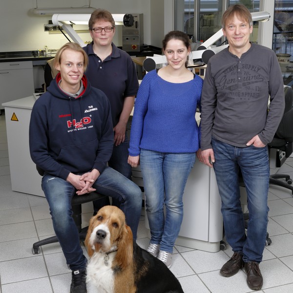 Wir, das sind Zahntechnikermeister Thomas Mesterschmidt, die Zahntechnikerinnen Frau Melanie Laabs und Frau Stephanie Püster, unser Auszubildender Herr Johannes Rossipal sowie unser Therapeut Hush.